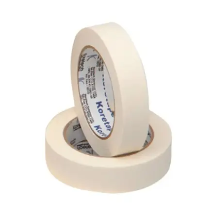 Fita crepe para uso geral produzida em papel crepado saturado branco com adesivo à base de borracha natural e resinas.