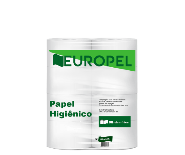 Papel Higiênico ROLÃO BRANCO europel 8X300m Composto de 100% de aparas branca comum reciclada, gramatura de 18/20 g/m2, embalado em saco plástico com 8 rolos cada.